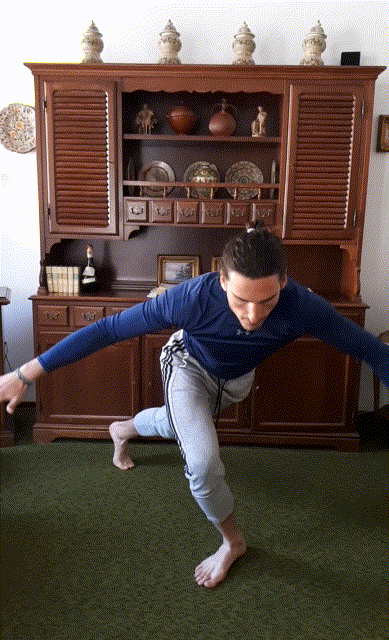 Può anche esser visto come una via di mezzo con un rinforzo muscolare, in ogni caso ti farà bene. Parti a piedi pari, e porta un piede indietro, più lontano è meglio è, e vai a “sfiorare” il pavimento. Ritorna col piede avanti e rifai, cambiando direzione. Non ingobbirti con la schiena ma scendi col sedere. Ricorda che stai allenando la gamba che sta ferma, non quella che stai muovendo.