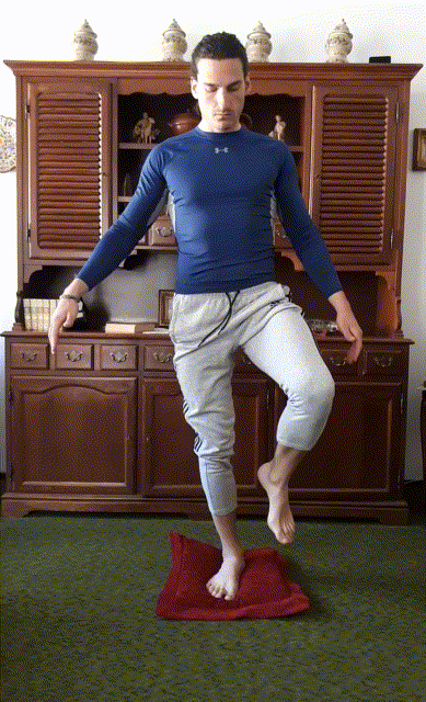 Troppo semplice? Hai due modi per complicarti la vita, e devi farlo se l’esercizio ti riesce troppo agilmente: il primo è chiudere gli occhi, il secondo è metterti sopra a delle superfici instabili (tavolette, cuscini, tappetini gommosi).